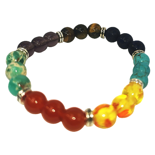 Pulseira com elástico, composta com pedra naturais nas cores que simbolizam os 7 chakras e detalhes prateados