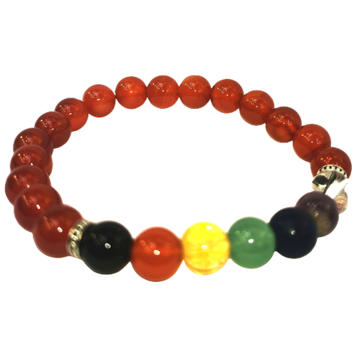 Pulseira com elástico, composta com pedra cornalina, detalhes prateados e 7 pedras naturais coloridas que simbolizam os 7 chakras