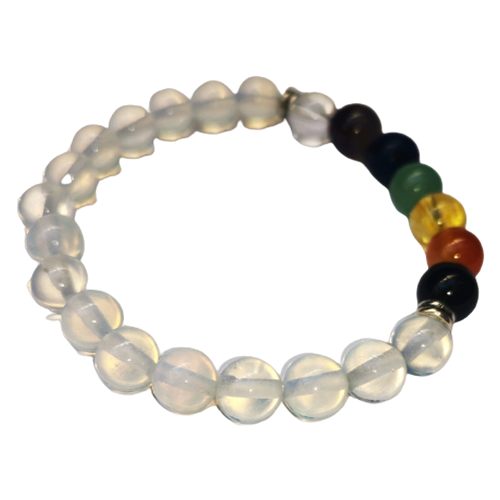 Pulseira com elástico, composta com pedra da lua, detalhes prateados e 7 pedras naturais coloridas que simbolizam os 7 chakras
