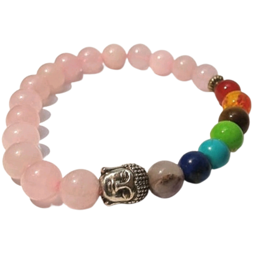 Pulseira com elástico, composta com pedra quartzo rosa, detalhes prateados e 7 pedras naturais coloridas que simbolizam os 7 chakras e rosto Buda