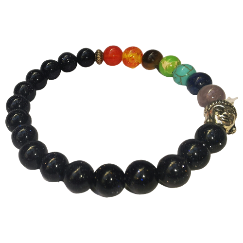 Pulseira com elástico, composta com pedra estrela, detalhes prateados e 7 pedras naturais coloridas que simbolizam os 7 chakras e rosto Buda