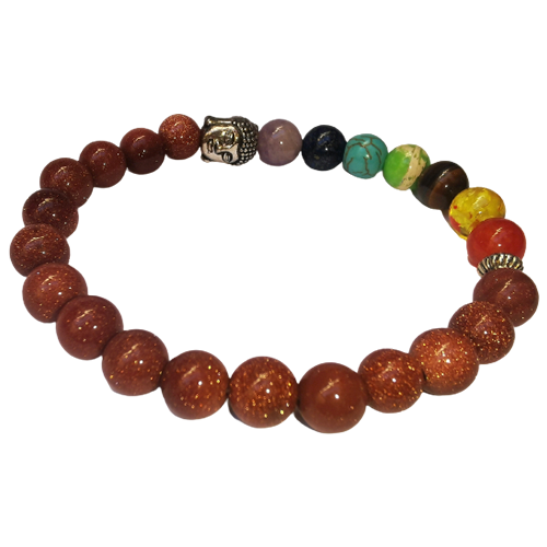 Pulseira com elástico, composta com pedra do sol, detalhes prateados e 7 pedras naturais coloridas que simbolizam os 7 chakras e rosto Buda