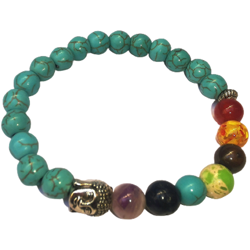 Pulseira com elástico, composta com pedra turquesa, detalhes prateados e 7 pedras naturais coloridas que simbolizam os 7 chakras e rosto Buda