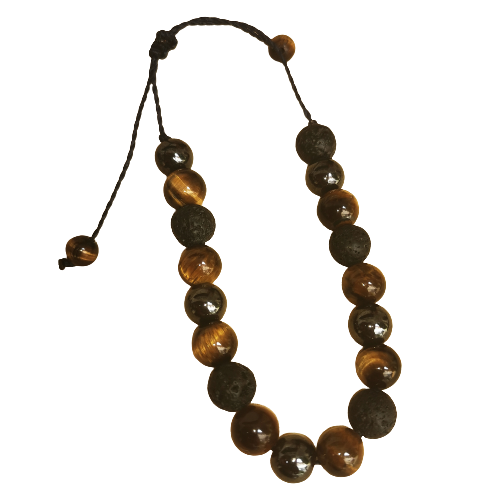 Pulseira ajustável, feita com cordão especial e pedras naturais olho de tigre, hematita e vulcânica