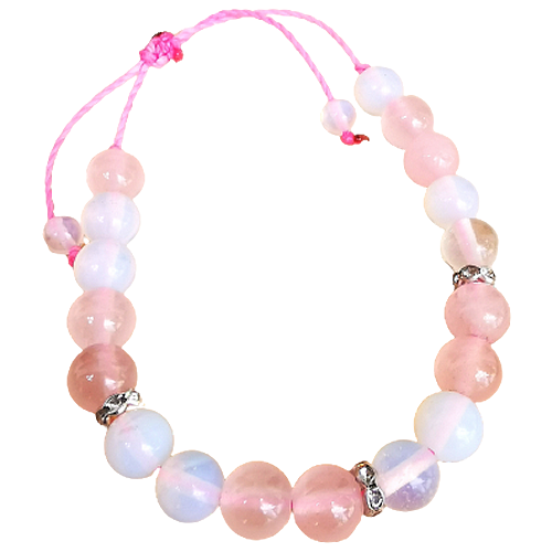 Pulseira ajustável, feita com cordão especial, e pedras quartzo rosa e pedra da lua, detalhes em prata com strass